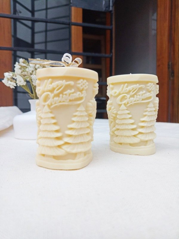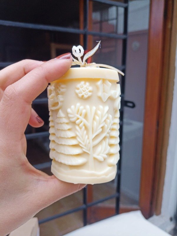 Vela en forma cilíndrica, tallada con motivos navideños (pinos muérdagos, copos de nieve, etc)
