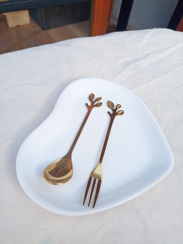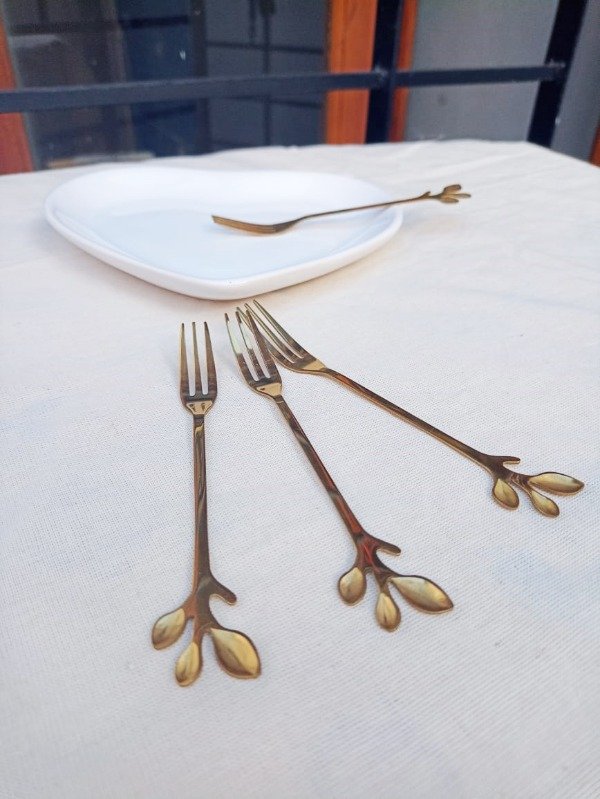 Hermoso, tenedor de postre de acero inoxidable en color dorado.