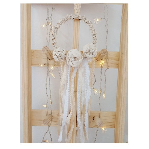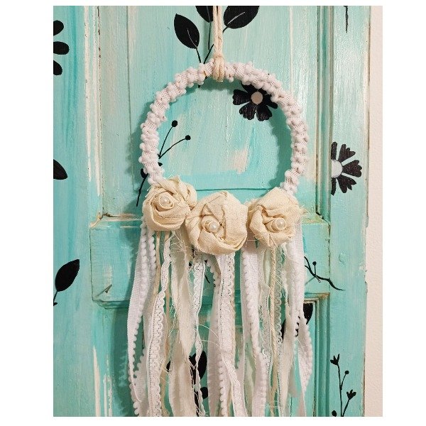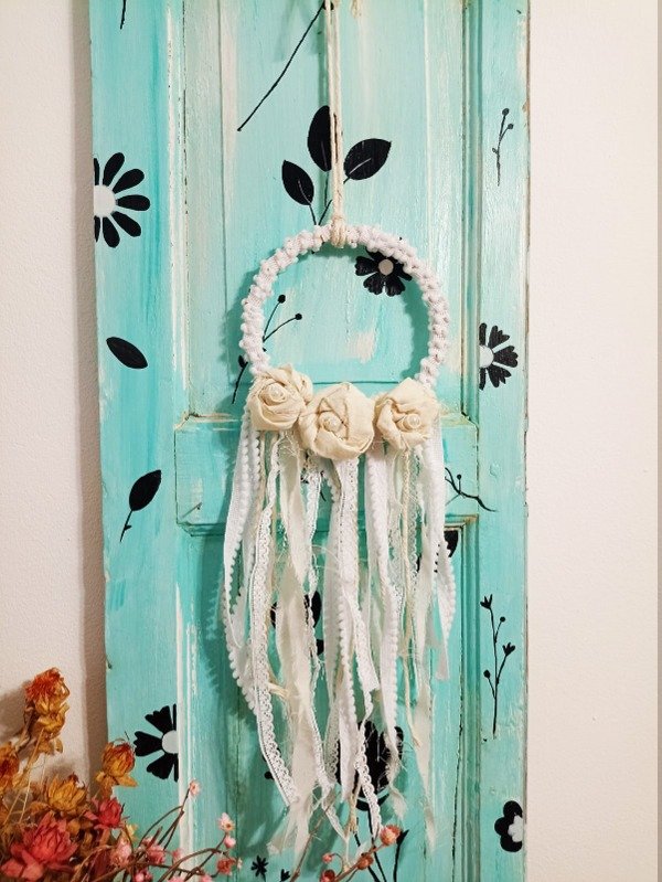 Colgantes con Rosas de lienzo, tiras de tela, puntilla y mini pompones, en tonos naturales.