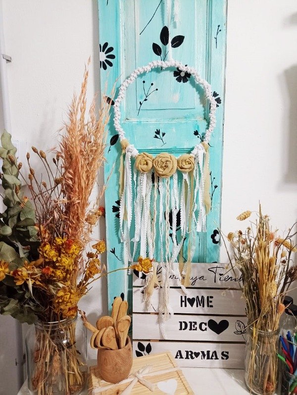 Colgantes con Rosas de lienzo, tiras de tela, puntilla y mini pompones, en color blanco y arena.