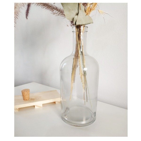 Florero de vidrio tipo botella de boticario, boca angosta.