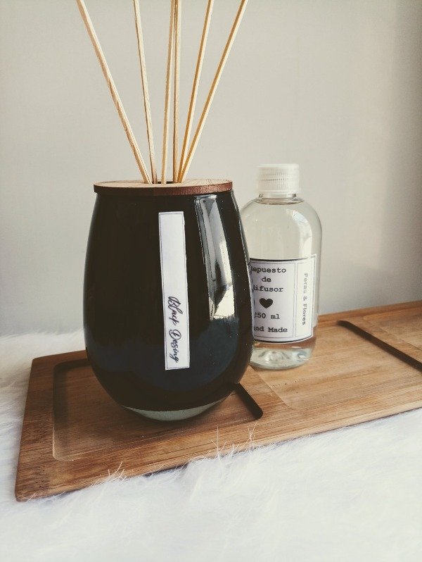 Difusor en vaso color NEGRO, modelo BLACK DESING de 450 ml con tapa difusora de madera + varillas