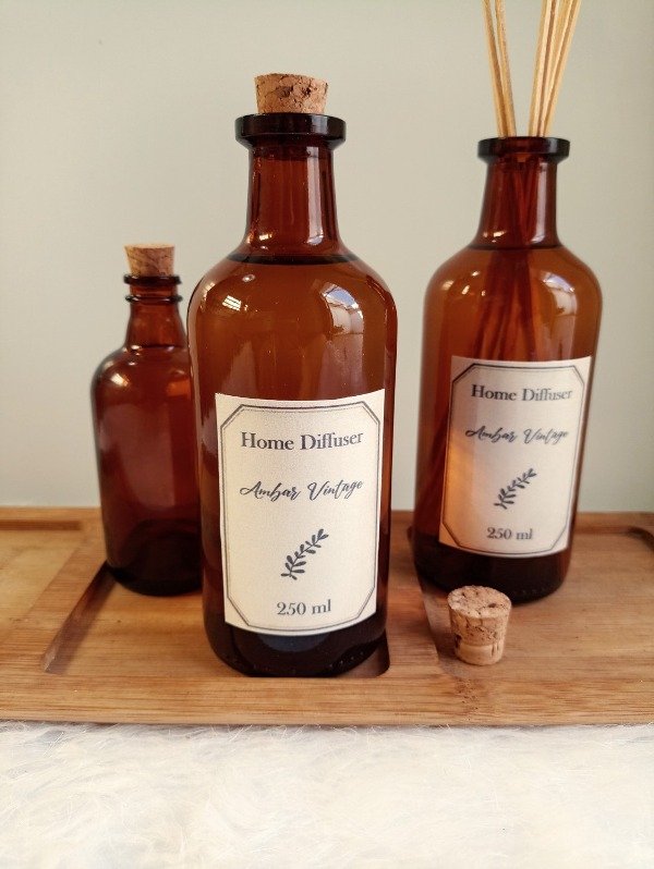 Difusor XL en envase de vidrio de 250ml, tipo boticario color AMBAR. Con tapa corcho