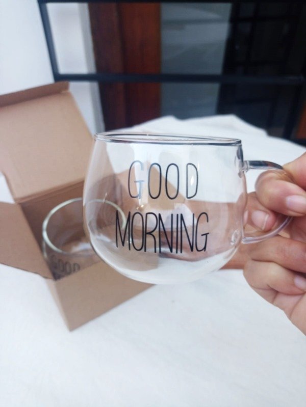 De 400ml, con asa de vidrio e inscripción en negro (good morning)