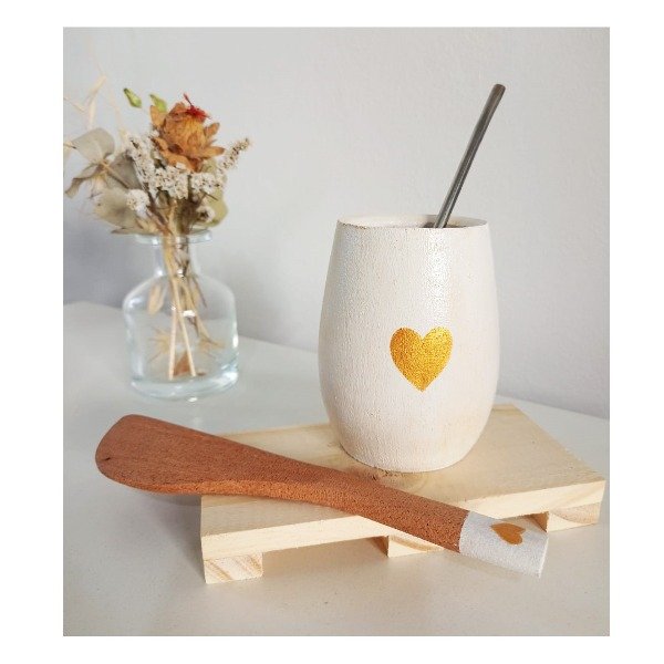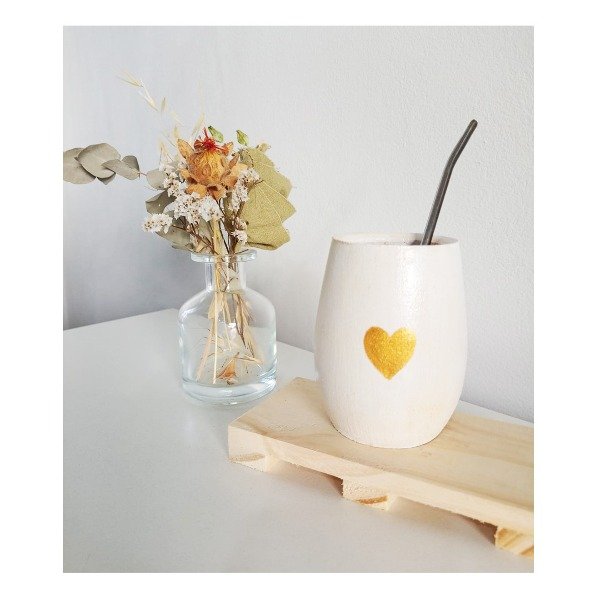 Mate de algarrobo tipo huevito, tamaño grande. Pintado a mano , color blanco con corazón dorado en el centro.