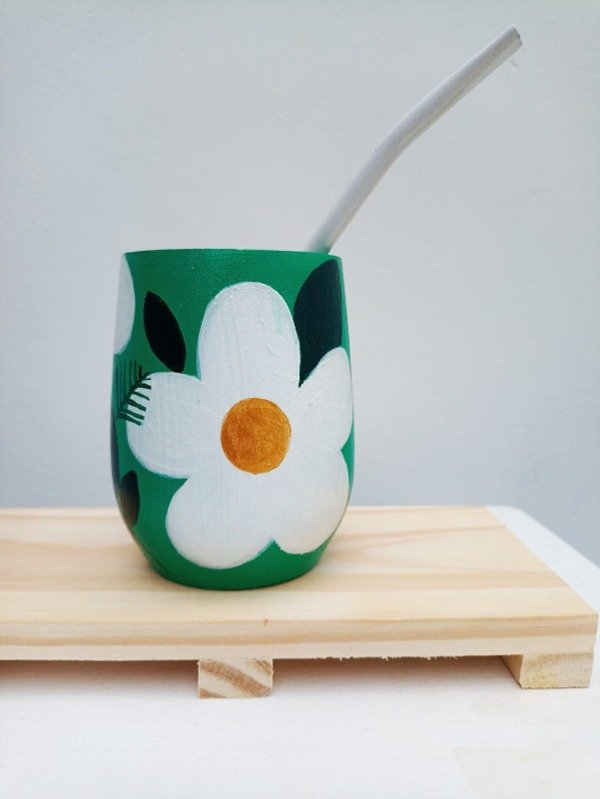 Mate de algarrobo tipo huevito, tamaño grande. Pintado a mano , color verde en diferentes tonos, flores blancas con centro dorado.