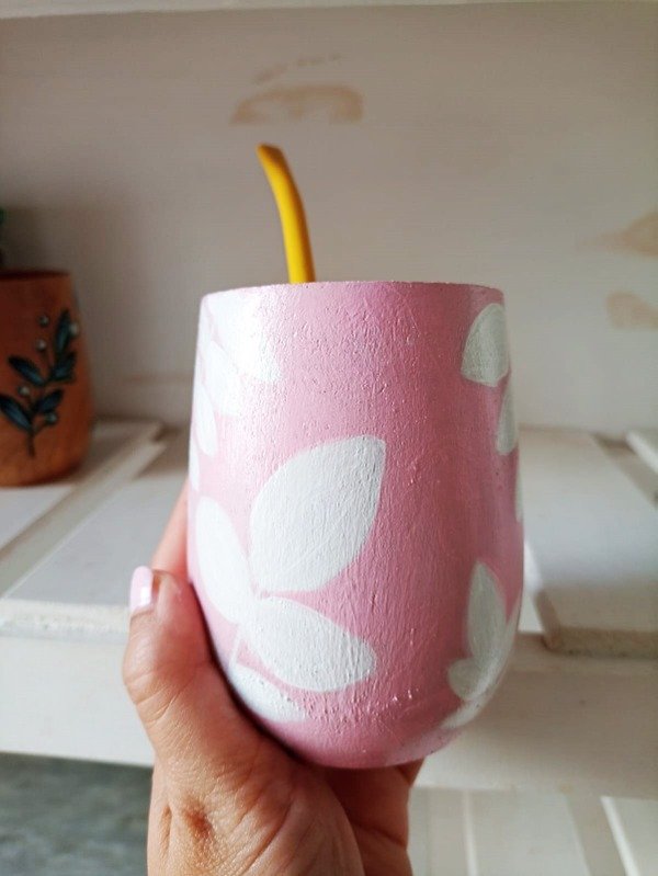 Mate de algarrobo tipo huevito, tamaño grande. Pintado a mano con diseño de hojas blancas y fondo en color rosa claro