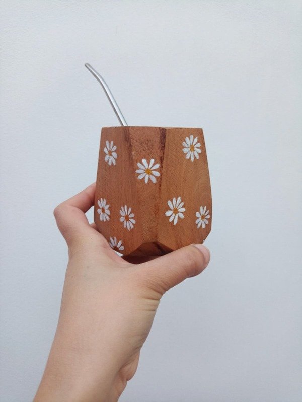 Set de algarrobo, pintado a mano con diseño de MARGARITAS en blanco y dorado.
