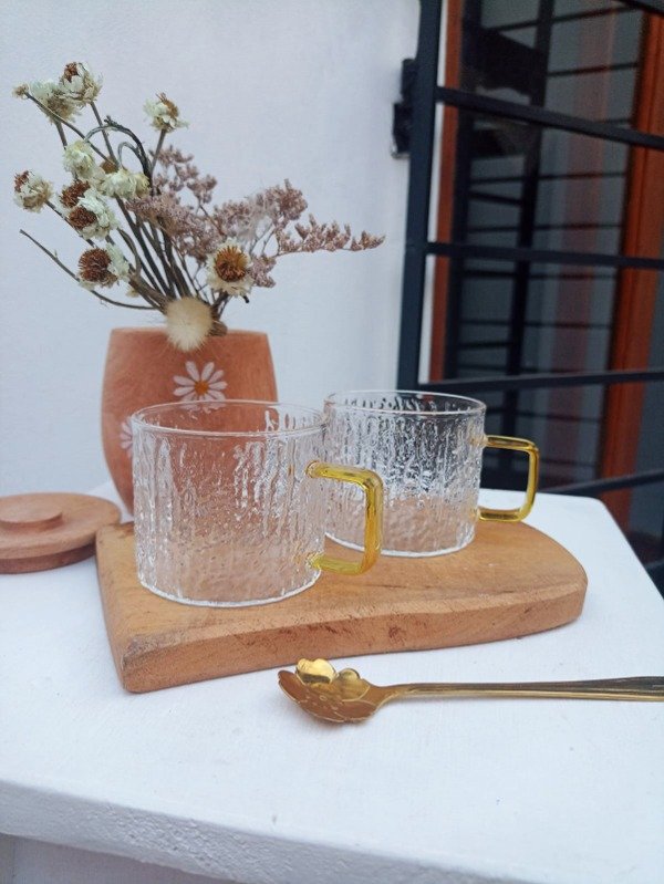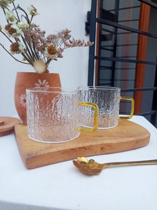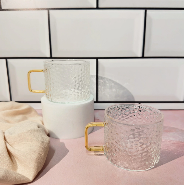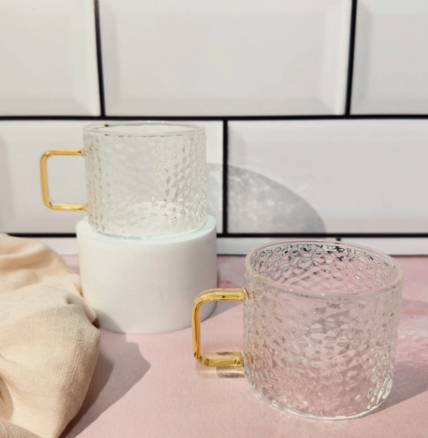 Taza de vidrio ideal para café, de vidrio súper fino y mango dorado. Labrada