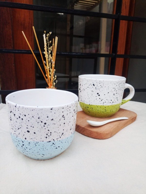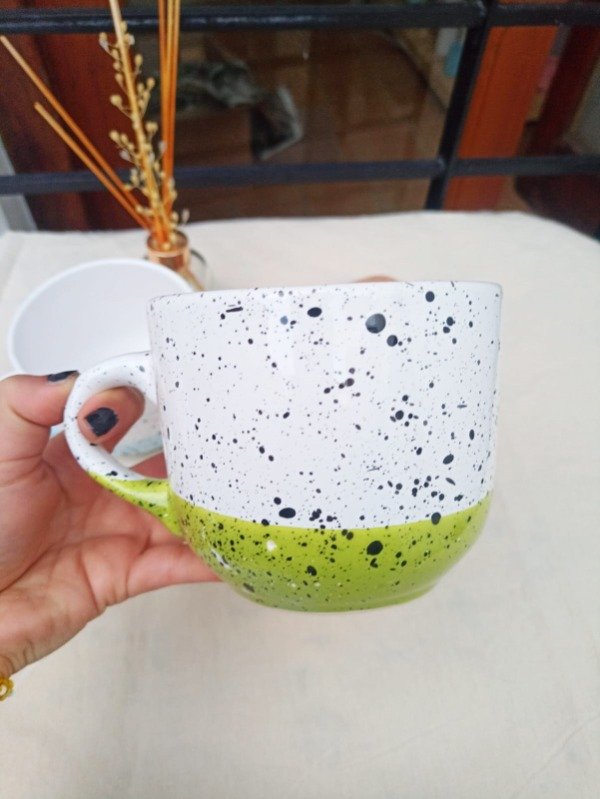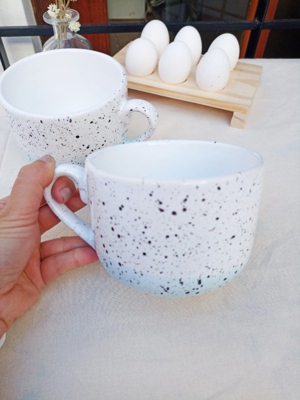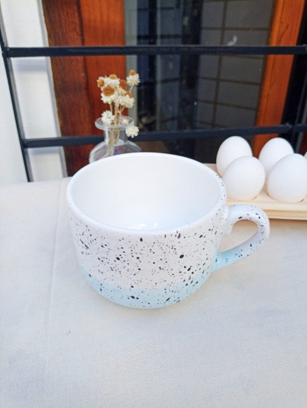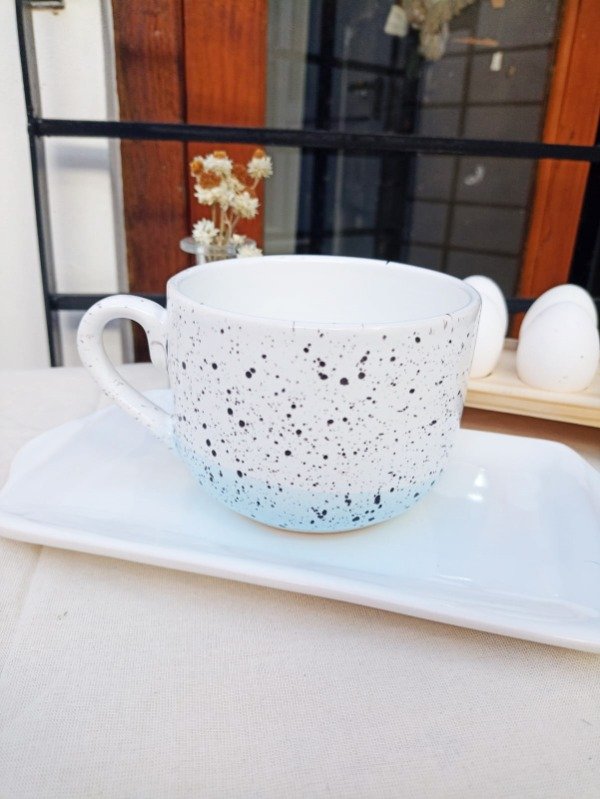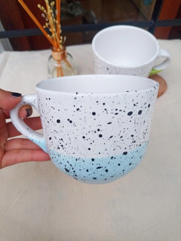 Es de color blanco con la base celeste clarito o verde (a elección y según disponibilidad) y puntitos en negro.