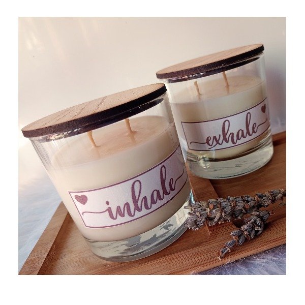 Dos velas en duo, de 250ml c/u en vaso de vidrio con mecha doble y tapa de madera.