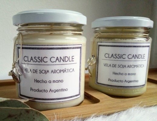 Vela en formato Frasco de vidrio de 200cm3, con tapa metalica y detalle en hilo y cuentas metálicas.