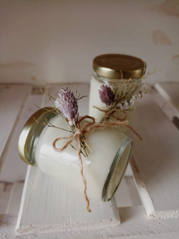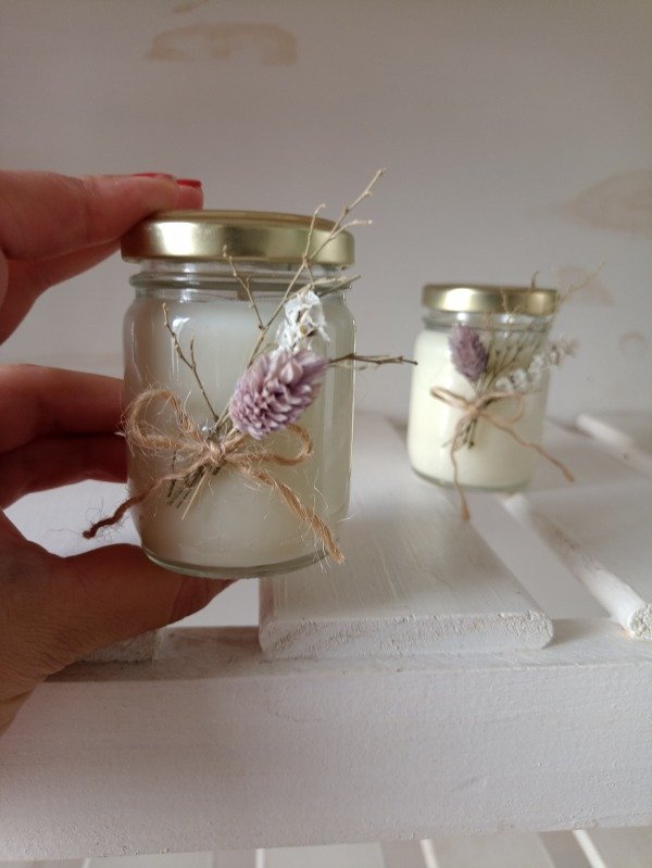 Velitas en frascos de 100ml, con tapa metalica y mecha simple. Viene con deco en flores secas como se ve en la imagen.
