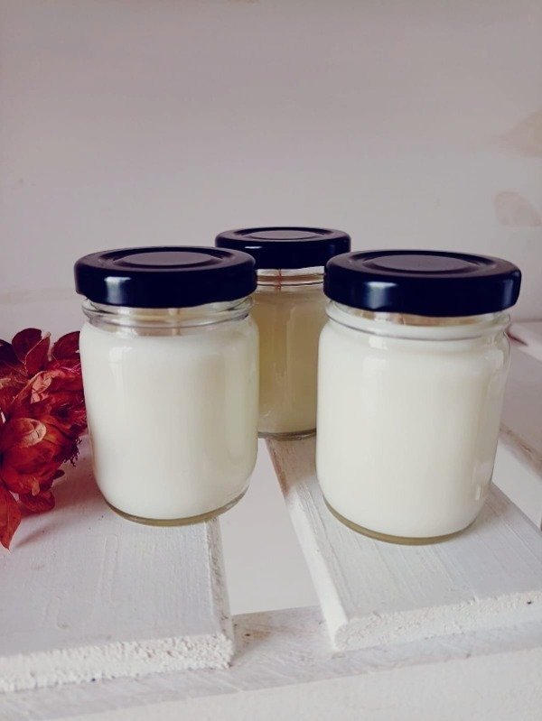 Velitas en frascos de 100ml, con tapa metalica y mecha simple.