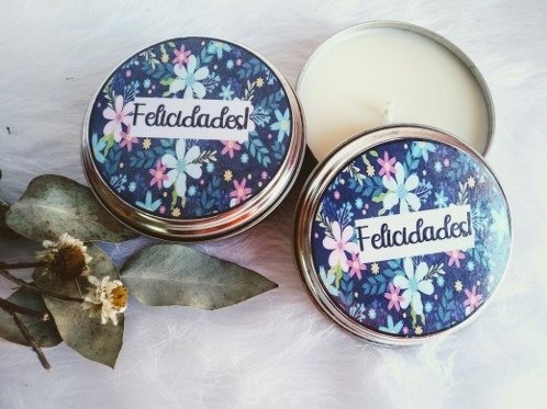 Vela en Lata de 100ml, mecha simple, diseño de etiqueta con frase FELICIDADES