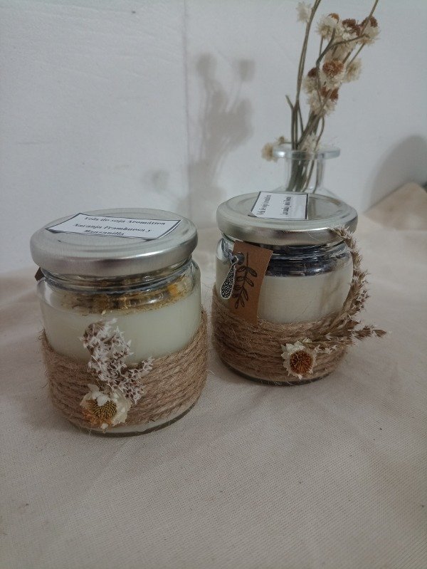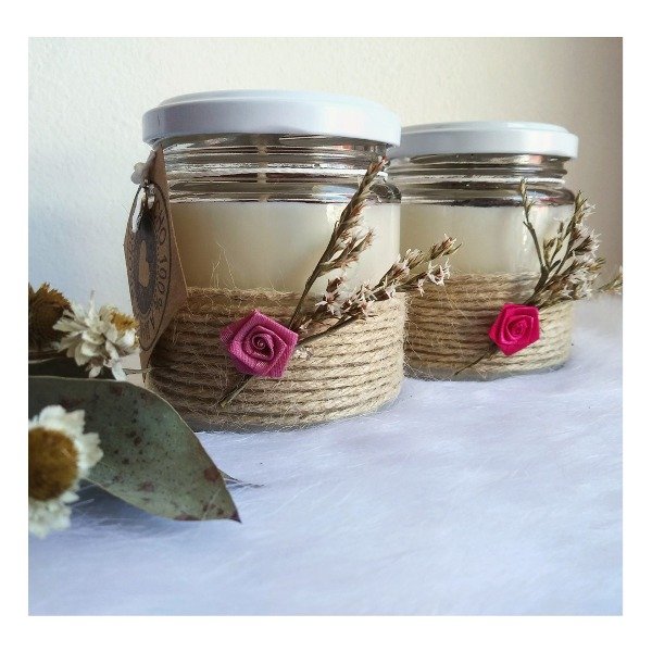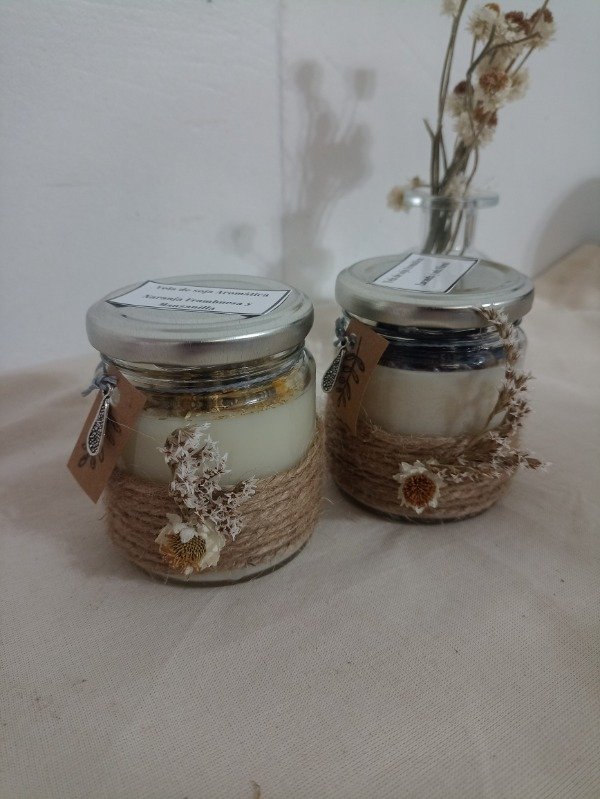 Vela en formato Frasco de vidrio de 200cm3, con tapa metálica, deco en hilo de yute + flor roco + flores secas.